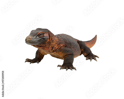© Te, Obraz premium A komodo dragon with dark markings on a black background.