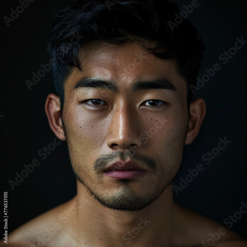© Eva, Obraz premium a Korean guy 35 years old model , black background , Sharp features, Handsome Korean model