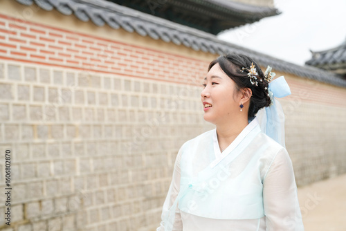 Fototapeta premium A Korean woman in her twenties wearing a sky-blue hanbok walks in front of...