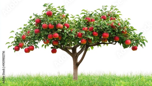 Fototapeta premium A laden apple tree with ripe red fruit, set against a white background and small patch of grass