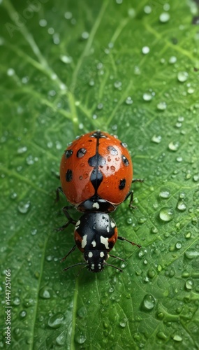 Obraz premium A ladybug, glistening with raindrops, rests on a vibrant green leaf , ladybug, green, red
