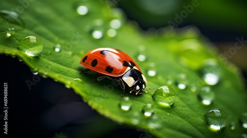 Fototapeta premium A ladybug has been observed crawling on a wet green leaf.
