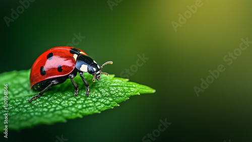 © Alexander, Obraz premium A ladybug is on a green leaf
