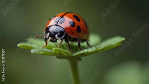 Fototapeta premium A ladybug perched on top of a rare four-leaf clover, ideal for illustrations and designs related to nature, good fortune,