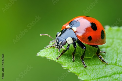 Fototapeta premium A ladybug rests on a vibrant green leaf, captured in stunning macro detail. Use it for nature blogs, garden guides, or insect conservation campaigns.