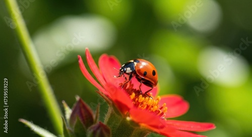 © DAVA, Fototapeta premium A ladybug rests on a vibrant red flower. Close-up view