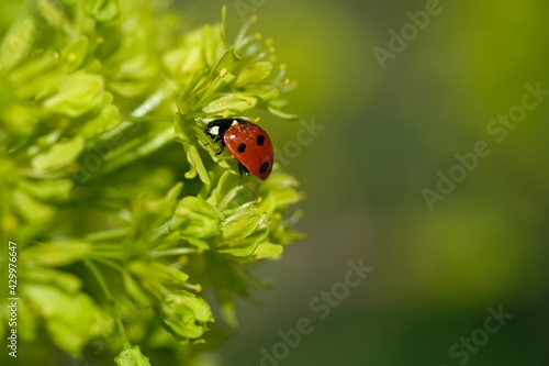 © Soyka, Naklejka premium A ladybug sits on a bud. Sunny day.