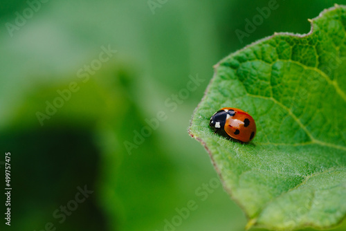 © Anastasia, Fototapeta premium A ladybug sits on a green leaf on a warm spring day.