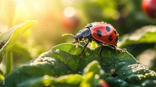 © Umi Sakina, Fototapeta premium A ladybug sits on a green leaf with sunlight shining in the background.