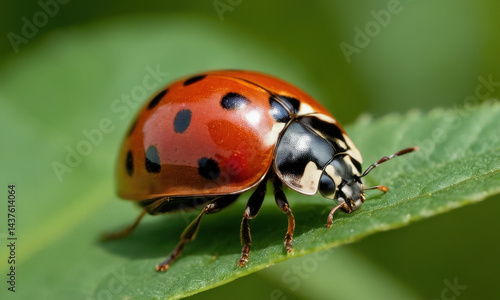 © Alena, Fototapeta premium A ladybug sits on the edge of a leaf, enjoying the sunshine