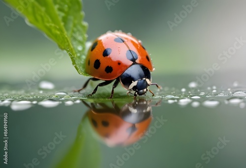 © Photo by mQ, Obraz premium A ladybug sitting on a leaf and drinking water from the lake. Macro photography