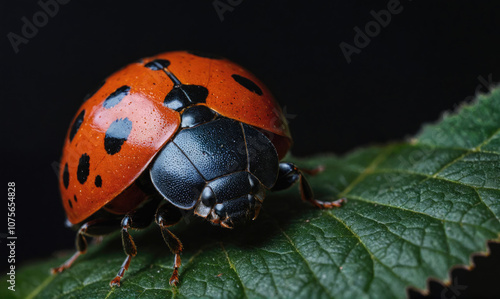 Fototapeta premium A ladybug with black spots rests on a green leaf