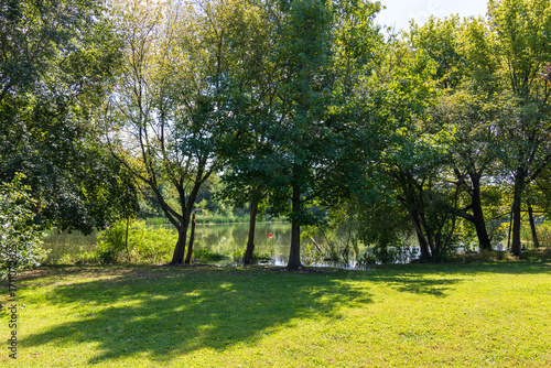 Naklejka premium A lake surrounded by lush green trees and grass at FDR Park in Philadelphia...