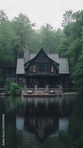 © Ardhana, Fototapeta premium A Lakeside House Surrounded by Lush Trees and Reflective Water