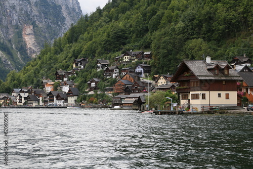 © Foto, Naklejka premium A lakeside town with colorful buildings and boats on the water, Austria