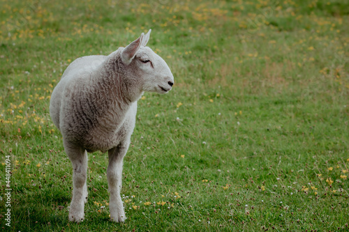 Fototapeta premium A lamb looking right in a meadow or field with white space