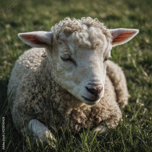 © Dogfeeding1997, Fototapeta premium A lamb sleeping peacefully in the grass.
