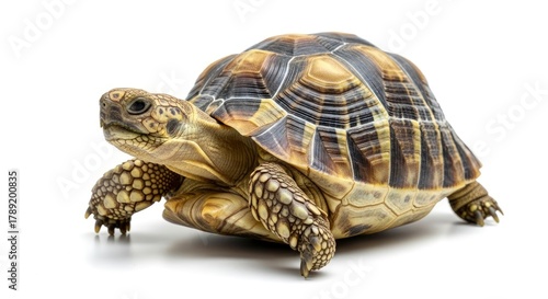 Obraz premium A land tortoise is positioned on a pure white surface showcasing its...