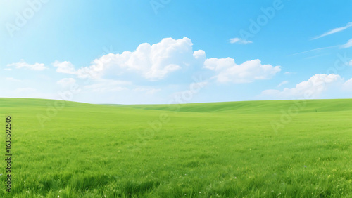 Obraz premium A landscape featuring a vibrant green field under a bright blue sky with...