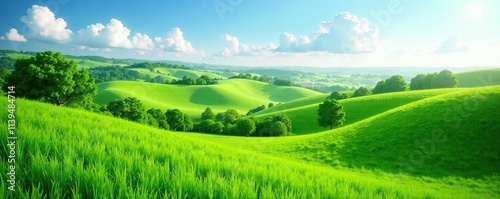 Fototapeta premium A landscape featuring rolling hills and green clumps, FreshGreenGrass,...
