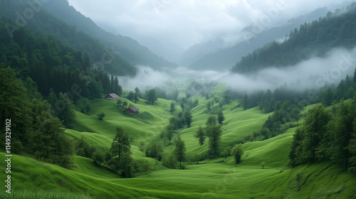 © Nature_Beauty, Obraz premium A landscape photo features a lush green valley surrounded by forested mountains