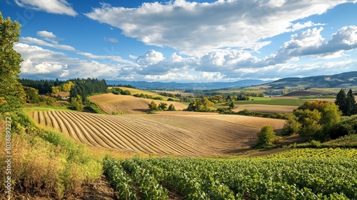 Fototapeta premium A landscape transformed through regenerative agriculture, featuring crop...