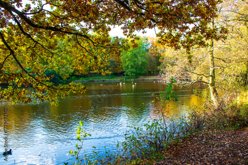 © Frank Goma, Fototapeta premium A landscape view of a lake with trees in autumn color with mirror reflection at Wollaton Country and Deer Park in Nottingham, UK.
