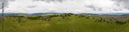 © Виталий Сова, Naklejka premium A landscape view of beautiful fresh green forest and Altai mountain background. Panoramic view of beautiful green forest in the Altai mountains