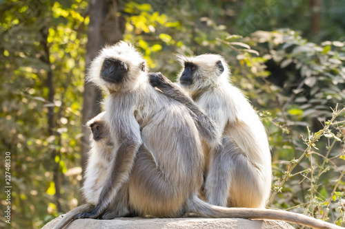 Obraz premium A langur family grooming on a wall inside Ranthambore national park