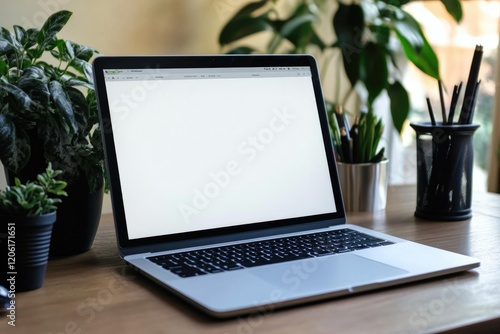 © Vii, Fototapeta premium A laptop computer sits on top of a wooden desk, perfect for working or studying