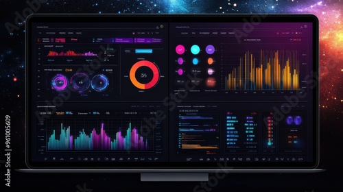 Obraz premium A laptop displaying a futuristic data analytics dashboard with vibrant charts, graphs, and metrics, set against a cosmic background symbolizing innovation and technology.