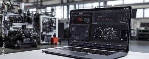 © Pumapala, Fototapeta premium A laptop displaying engineering data in a modern industrial setting.