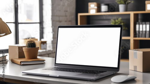 © anantachai, Fototapeta premium A laptop in a modern workspace with boxes and office supplies in the background.