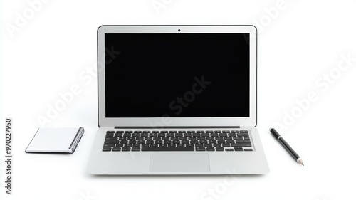 © Space Priest, Fototapeta premium A laptop is open on a table with a pencil and a notebook