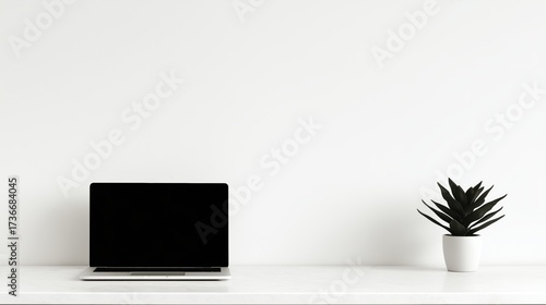 © Blessed Pixel Works, Obraz premium A laptop on a white desk with a potted plant