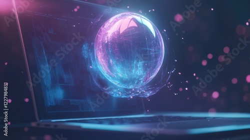 © G.Go, Obraz premium A laptop screen shows a glowing sphere with a splash of water