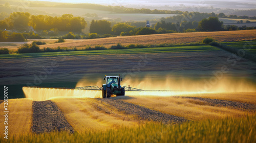 © ColdFire, Fototapeta premium A large agricultural field with a tractor. Preparing the land for sowing with a picturesque landscape with hills