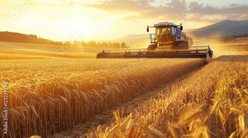 © Boonnam Burart, Fototapeta premium A large agricultural machine harvesting crops during the late afternoon light.