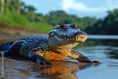 © NikahGeh, Obraz premium A large alligator rests near the water on a sandy shore