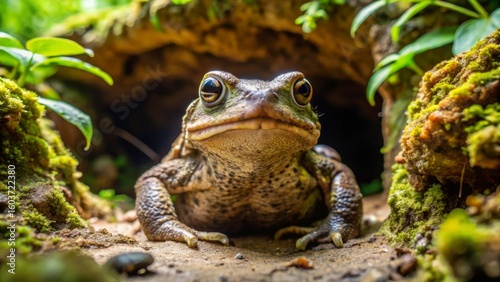 Fototapeta premium A large amphibian, possibly a toad, emerges from a mossy crevice, its powerful physique and striking eyes captivating the viewer in a detailed close-up shot.