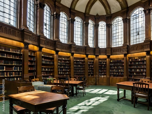 © Rafli, Naklejka premium A large and luxurious library with tables and chairs with a large fireplace in the center