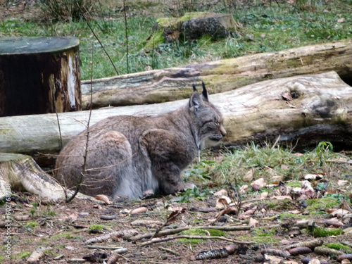 © Serhii, Obraz premium A large animal, a lynx, sits in the forest, clinging to the ground near a tree
