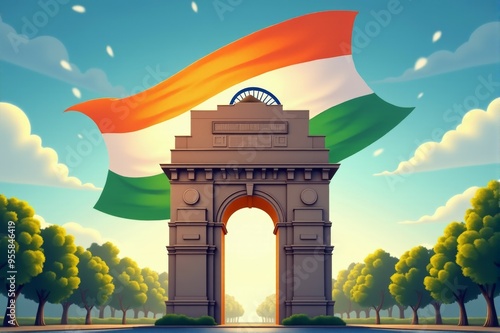 © Space Priest, Fototapeta premium A large archway with a flag flying above it