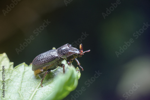 Naklejka premium A large black beetle on a green leaf. Macro photography of insects, copy...