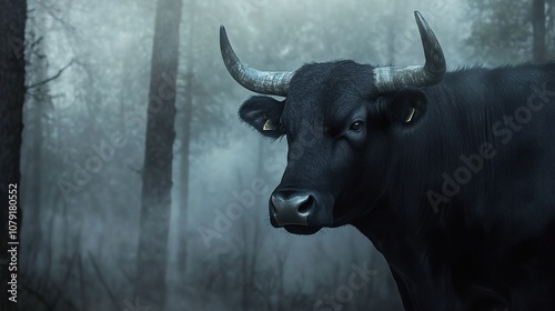 Naklejka premium A large black bull stands in a misty forest, its dark form contrasting with...