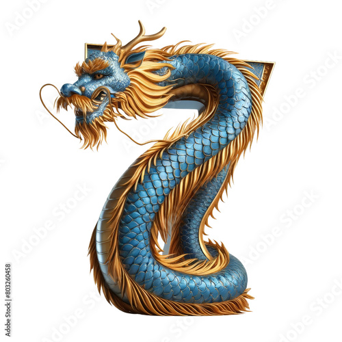 © peerasak, Obraz premium A large blue dragon with gold accents and a long tail. The dragon is curled up and has a number 7 on it, isolated on a transparent background.