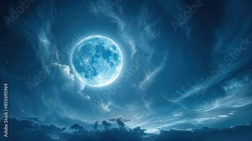 © Thanaporn, Fototapeta premium A large blue moon is shining brightly in the night sky
