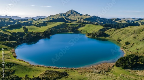 © Atthapon, Fototapeta premium A large body of water surrounded by green grass and mountains