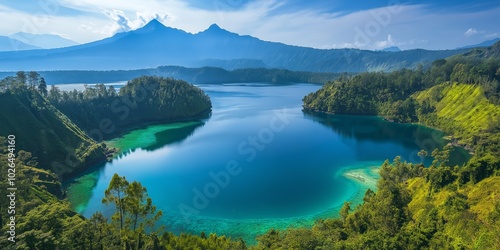 Naklejka premium A large body of water with mountains in the background. The water is blue and calm. The mountains are in the distance and the trees are lush and green. The scene is peaceful and serene