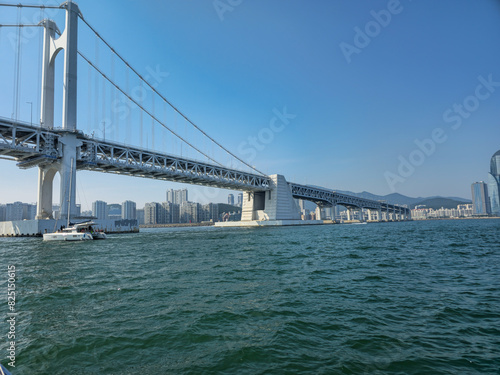 © oybekostanov, Naklejka premium A large bridge spans a body of water, with a boat in the foreground. The bridge is a modern structure, and the water is calm and clear. Concept of tranquility and peacefulness, as the bridge